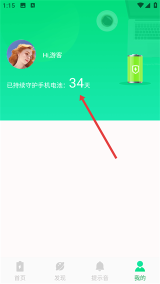 3、进入“我的”页面后,找到并查看【已持续守护手机电池-34天】的信息,以此知晓该应用为电池提供守护的时长情况。