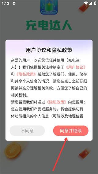 1、仔细阅读【用户协议】与【隐私政策】,在清楚了解个人信息的使用规则后,点击【同意并继续】按钮,即可进入【充电达人】的功能操作界面。