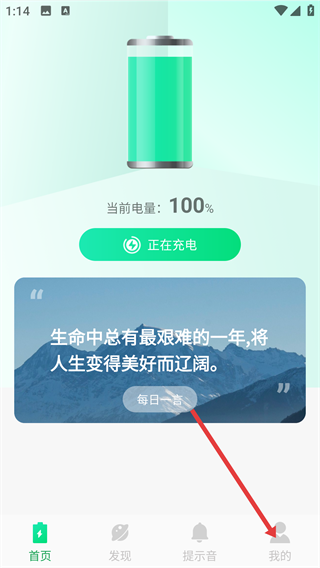 2、在显示【当前电量-100%】的首页,点击底部的【我的】按钮,即可进入包含电池守护信息的个人功能界面。