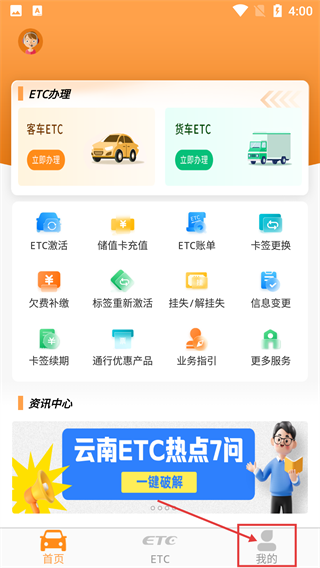 进入首页后,您可以办理【客车ETC】【货车ETC】业务,也能使用【ETC激活】等功能,点击底部的【我的】即可进入个人页面。