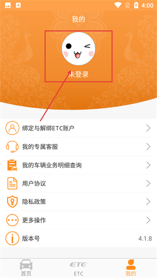 3、个人页面会显示【未登录】状态,在此状态下可执行【ETC账户的绑定与解绑】操作,点击头像区域即可触发登录流程。