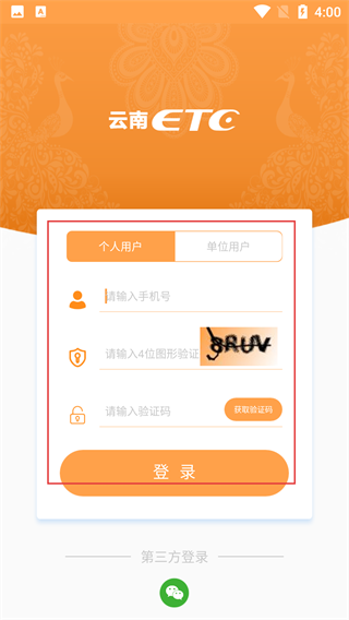 4、进入登录页面后,可选择【个人用户】或【单位用户】身份,输入手机号与短信验证码,再点击【登录】按钮完成登录;此外,也能通过微信第三方登录方式进入系统。