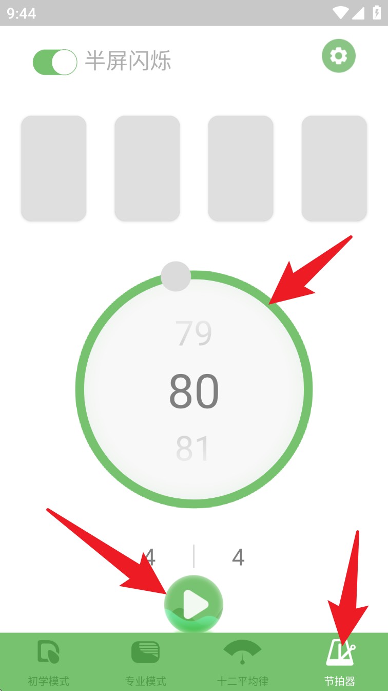5. 点击“节拍器”模块,能够对节奏速度和拍号进行设置,按下开始按钮就能开启跟拍练习。