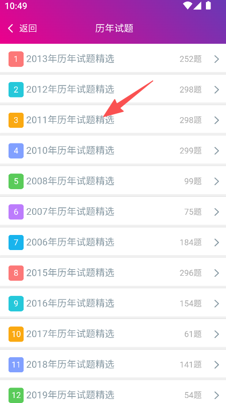 1、打开软件进入历年试题板块,查看历年试题章节考点评析及历年试题分类。