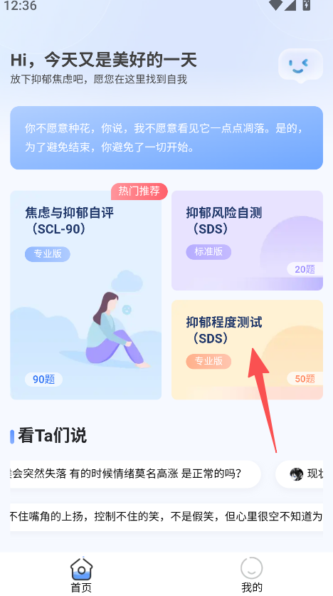 3、配备用户交流功能,包含情绪状态探讨板块,为用户心理互动搭建平台,完善自测体验。