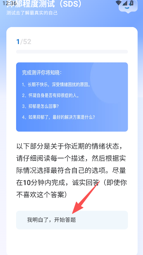 2、以自我认知为核心导向,配备详尽的测试说明与清晰的答题流程,帮助用户准确把握自身情绪状态,从而充分满足其心理自测的实际需求。