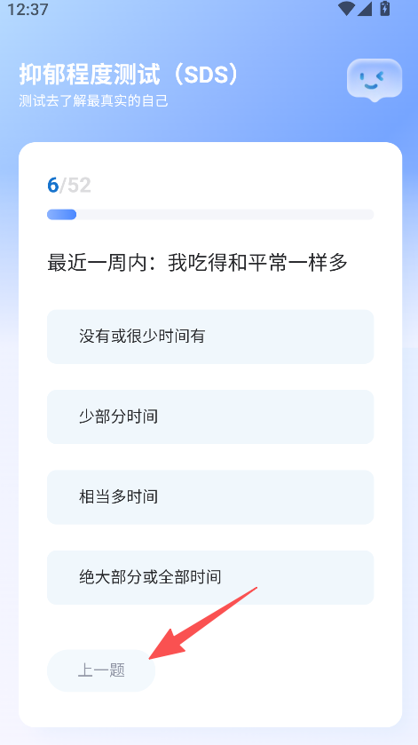 2、操作简单易懂,答题步骤清晰明了,还能随时返回调整上一题的答案,就算是第一次做心理自测的新手也能轻松上手,完成效率很高。