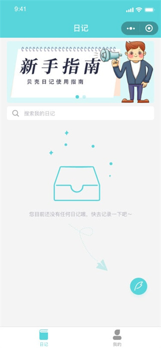 1、在本站完成安装后点击打开应用,首次进入贝壳日记本时,日记列表会显示为空,此时点击界面上方的羽毛笔按钮,就能开始撰写日记了。