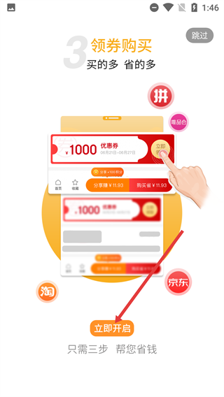 1、这是优惠券类应用的引导页面,点击【立即开启】按钮后,就能进入应用主界面,开启领取各平台优惠券、参与拼单等省钱活动。