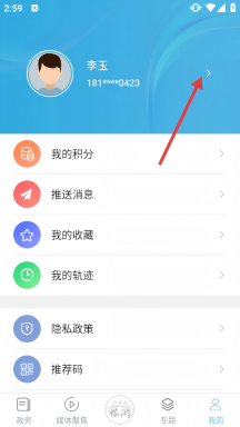 2、进入个人中心页面后,点击用户姓名旁边的箭头图标,即可进入我的信息页面。