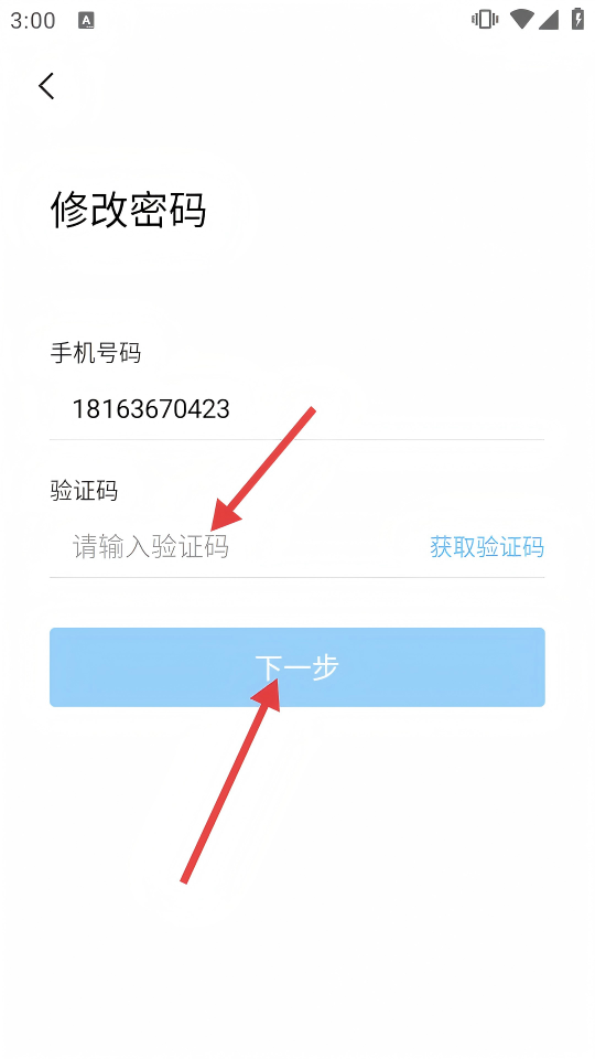 4、进入修改密码页面后,点击【获取验证码】按钮,输入收到的短信验证码,再点击【下一步】,根据页面提示完成新密码的设置操作。
