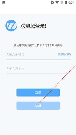 2、确认程序仅限研技工业技术公司内部使用后,在对应的输入框中填写手机号码,点击【获取验证码】按钮,输入收到的验证码,最后进行【登录】操作。
