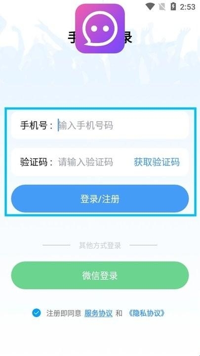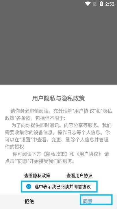 1、在本站参与夜聊后打开软件,仔细阅读弹出的用户隐私与隐私政策内容,勾选【选中表示我已阅读并同意协议】选项,随后点击【同意】按钮。