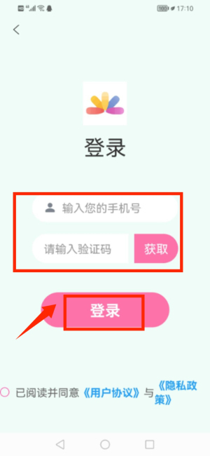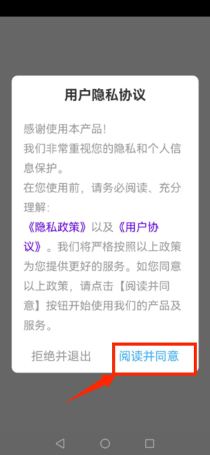 启动应用程序后,在弹出的隐私协议窗口中点击“阅读并同意”按钮,即可进入登录界面。