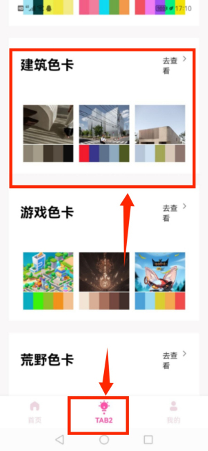 4、切换到TAB2页面,查看建筑色卡、游戏色卡这类专业色彩分类并进行浏览。