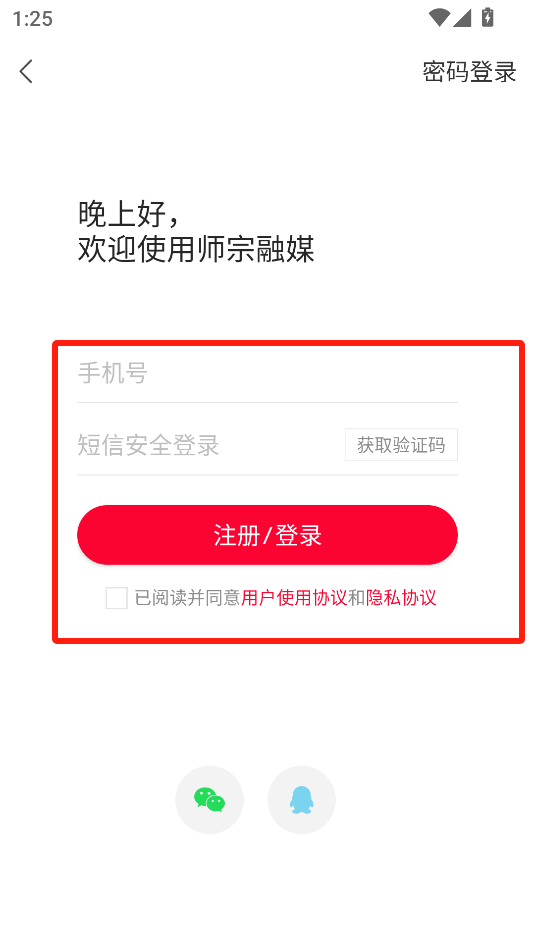 3、在窗口填写手机号和验证码,点击注册/登录。