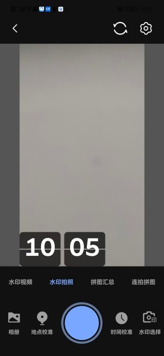 在水印拍照页面,用户能够完成时间校准与地点校准操作,同时也可以挑选水印来添加水印模板。