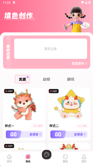 2、填色创作板块不仅提供了丰富多样的素材,还具备填色记录查看功能,能让用户轻松回顾个人创作历程,直观见证绘画水平的提升。