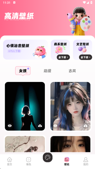 4、壁纸页面包含心情治愈壁纸、森系壁纸、文艺壁纸,此外还有女孩、动漫和古风等分类。