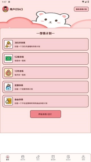 首页设有存钱计划板块,里面包含多种不同的存钱方式,能让我们方便地参考和尝试。