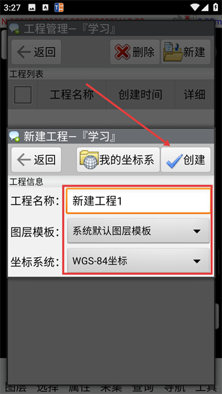 2、在新建工程界面完成工程名称、图层模板以及坐标系统的设置后,点击【创建】按钮。
