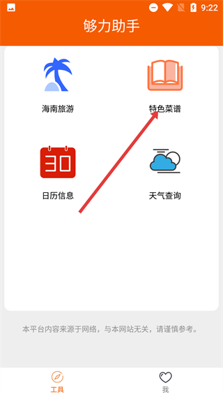 1、打开【够力助手】的工具页面后,找到【特色菜谱】选项并点击,就能进入对应的菜谱查询板块。