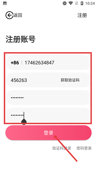 4、在账号注册页面依次填写【手机号码】,获取并输入【验证码】,设置好密码后,点击【登录】按钮即可完成注册并同步登录账号。