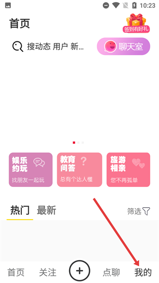 1、点击首页底部的【我的】按钮,就能进入个人相关页面;首页包含【娱乐约玩】、【教育问答】等功能板块。