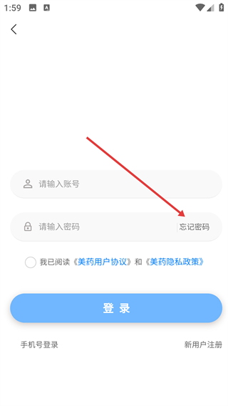 在美药应用的登录界面,要是忘记了密码,点击【忘记密码】按钮,就能进入身份验证的流程页面。