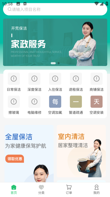 3、首页设有各类保洁服务的入口,您只需挑选所需的服务并点击进入即可。