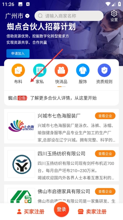 3、进入主页后,能看到蜘点招募计划,还可以搜索商家,平台设有布料、家私、快消品、复试等分类板块,用于展示各类企业的相关信息。