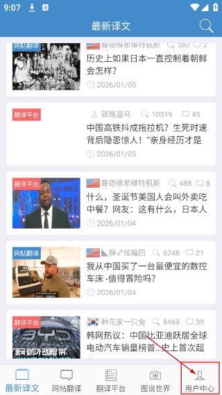 1、在【最新译文】页面,能查看各类译文内容,点击底部的【用户中心】按钮,就能进入与个人功能相关的操作板块。