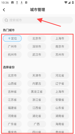 4、你可以选择推荐的热门城市,也可以在搜索框输入关键字来查找自己心仪的城市。