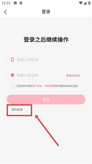3、进入登录页面后,点击【密码登录】选项,即可切换到需要填写手机号和密码的登录表单界面。