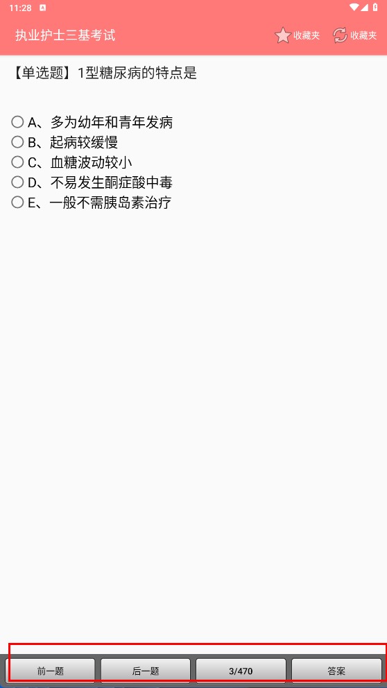 在做“1型糖尿病特点”这道题时,选择选项A(多为幼年和青年发病),借助页面底部的“前一题”“后一题”以及“答案”按钮,来切换题目并核对答案,以此进行系统备考。