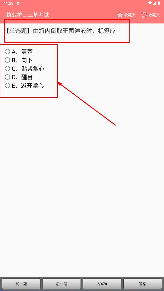 3、比如在解答“倒取无菌溶液时标签如何处理”这道题时,依据自身判断选择答案C(贴紧掌心),这样做是为了防止标签受到污染。