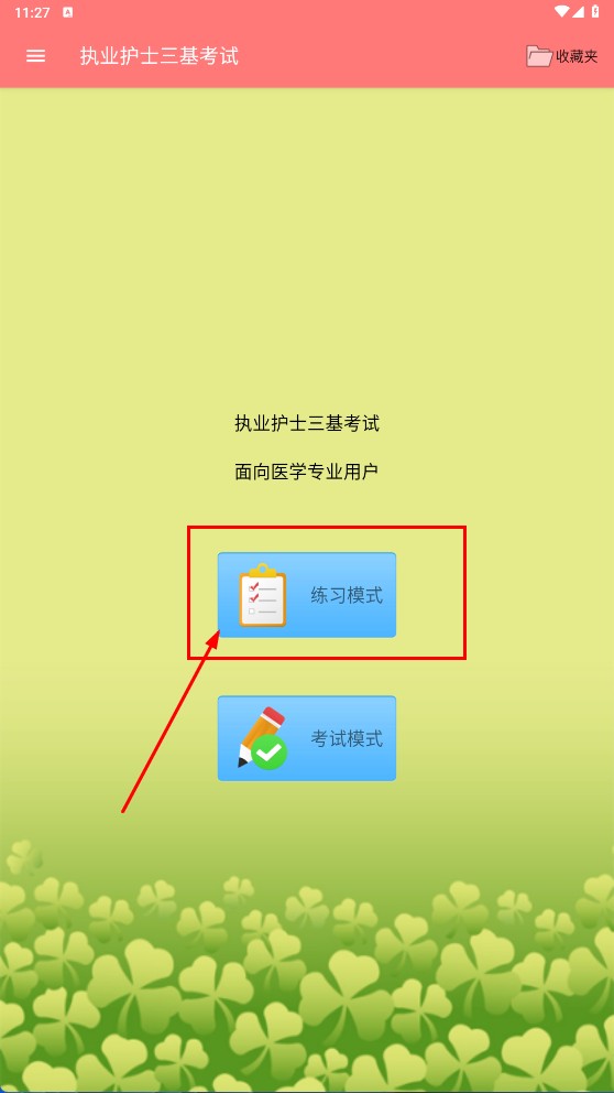 1、点击【练习模式】,进入执业护士三基考试练习界面,为医学专业用户开启备考通道。