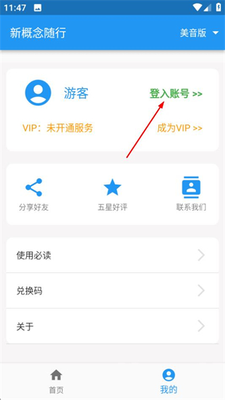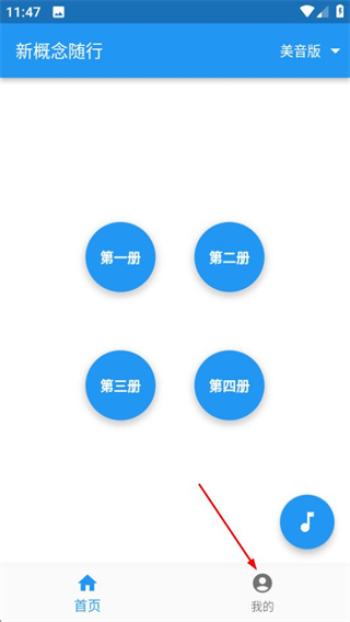 1、打开新概念随行APP后,在首页点击底部导航栏的“我的”按钮,即可进入个人中心页面。