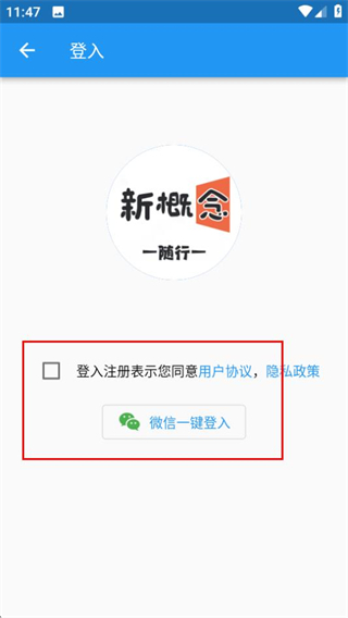 3、进入登录页面后,先勾选相关协议,再点击微信一键登录按钮,即可完成账号登录流程。