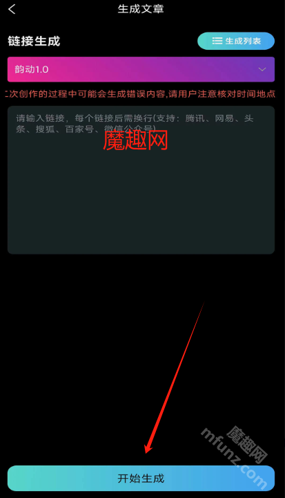 5、在文本框里粘贴链接,或是输入文字描述、主题,点击开始生成按钮就行