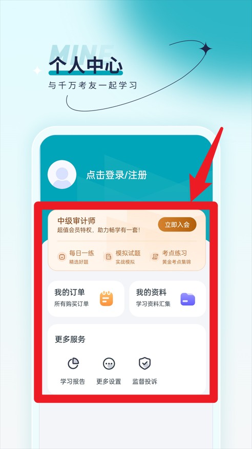 5、个人中心支持订单与资料的查看,会员功能涵盖每日一练、模拟题库等专属服务。