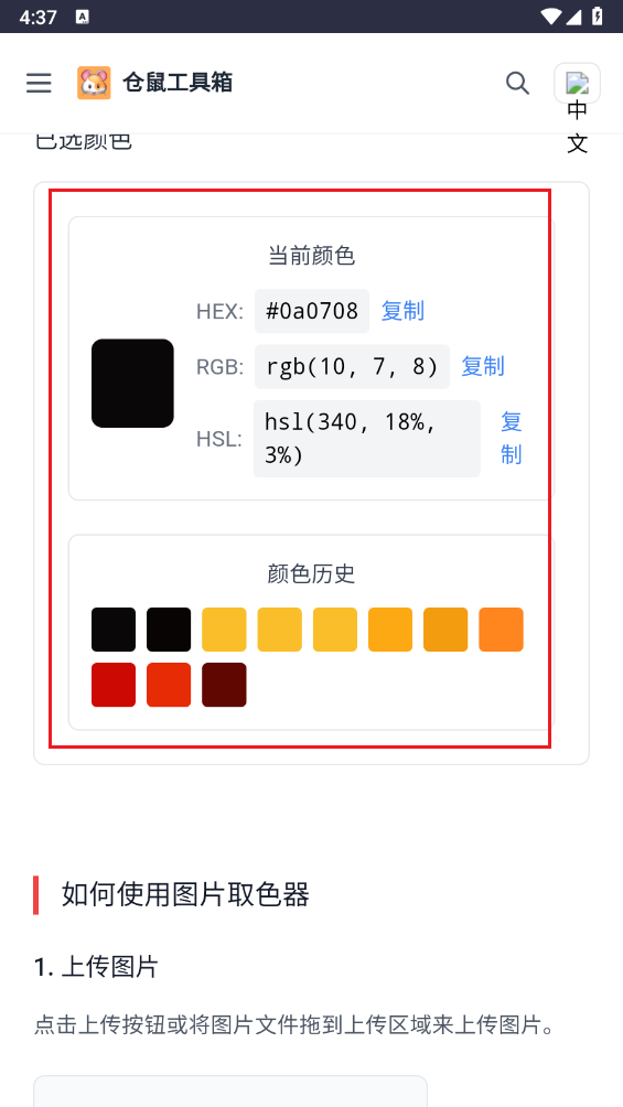 4、即刻获取HEX、RGB、HSL颜色代码,一键复制任一格式的颜色代码即可用于你的项目。