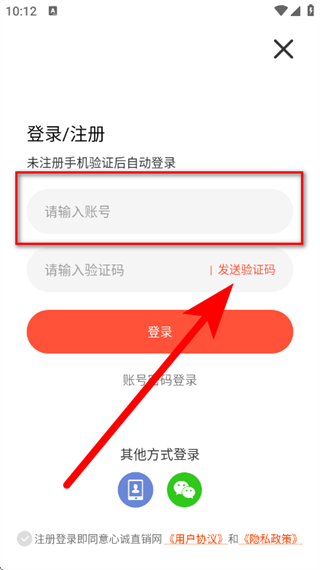 3、进入登录注册页面后,填写账号或手机号码,接着点击发送验证码的按钮。