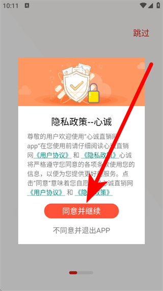 1、打开心诚直销网,当页面弹出隐私政策相关提示框时,点击“同意并继续”按钮。