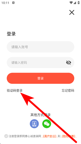 2、在登录页面,点击验证码登录选项,即可进入登录注册页面。