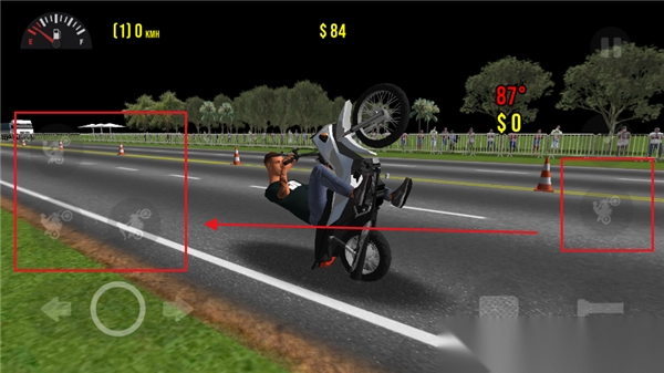 2、屏幕右侧的第一个动作是让摩托车头翘起来,与驾驶操作一同按下,就能做出车头翘起并前进的特技。