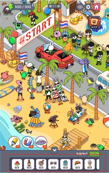 1、进入寻物模式关卡后,根据任务栏中的物件在场景中进行寻找隐藏物品。