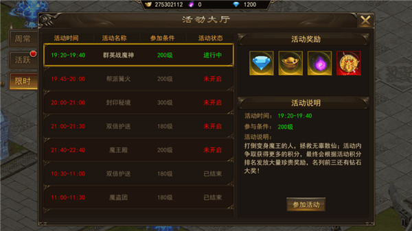 2、巅峰对决,跨服英雄会、跨服大乱斗、跨服行会战等多样跨服战役,助力你勇攀巅峰,成就王者之位。