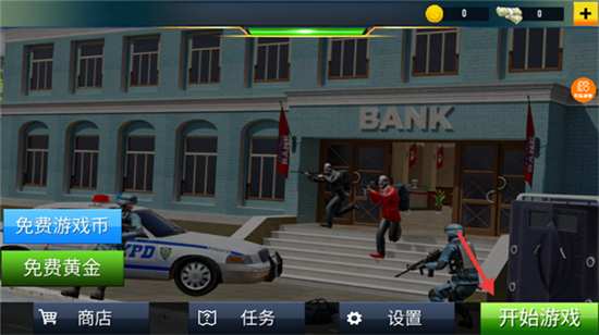 1、主界面领【免费游戏币】【免费黄金】,点击【开始游戏】,备战银行劫案任务。