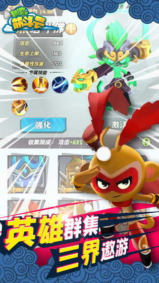 翻滚吧筋斗云这款游戏的菜单,以家喻户晓的西游人物为背景,融入当下热门的roguelike闯关模式。玩家每次突破关卡时,都会随机获取各类不同能力,合理搭配这些技能,能助你更轻松地闯关成功!